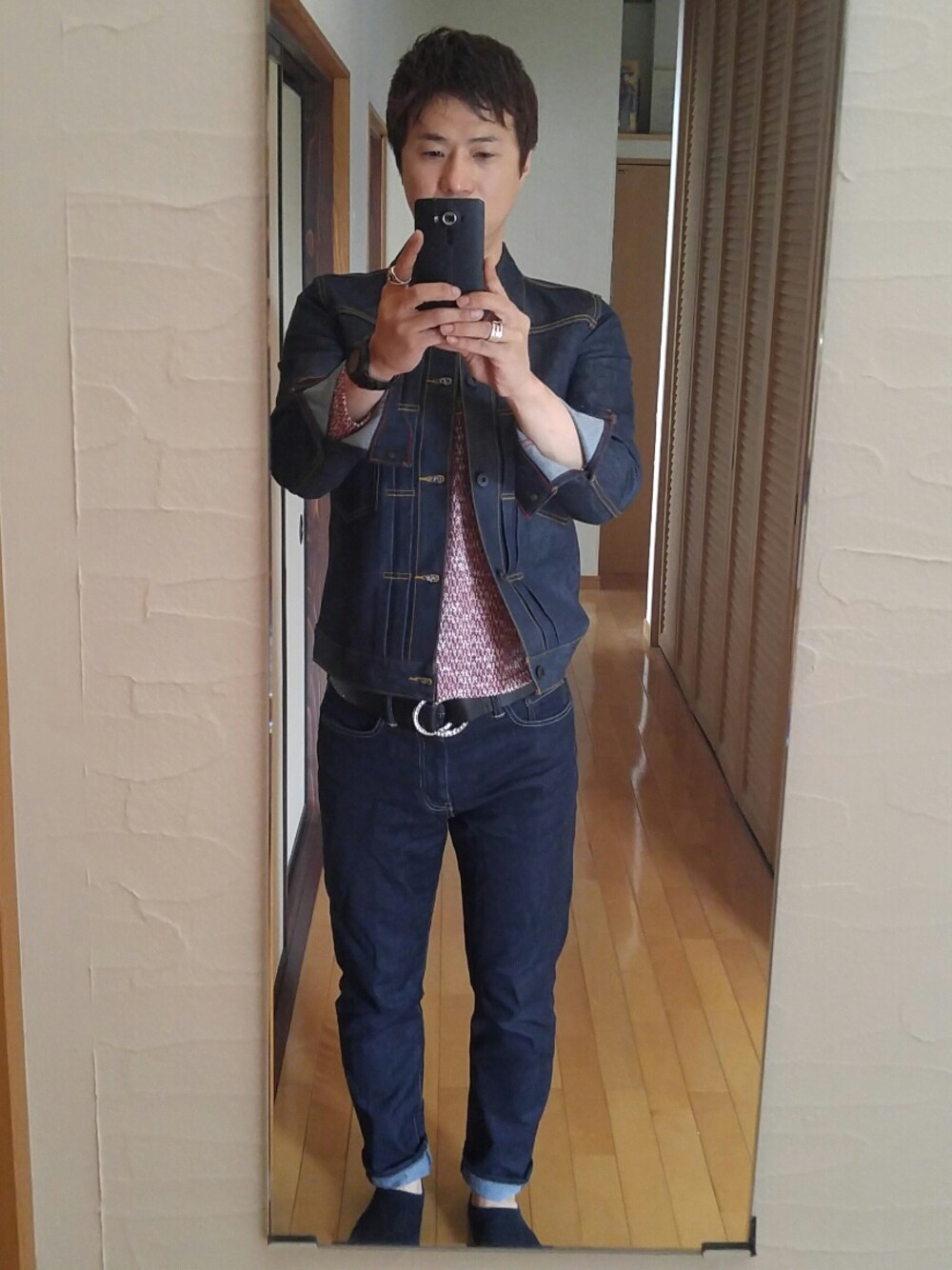 今日はデニム屋さんらしくデニデニで♪ 上下リジッドカラーで合わせて、ニットソー、ベルトでグラマラスにしてみました