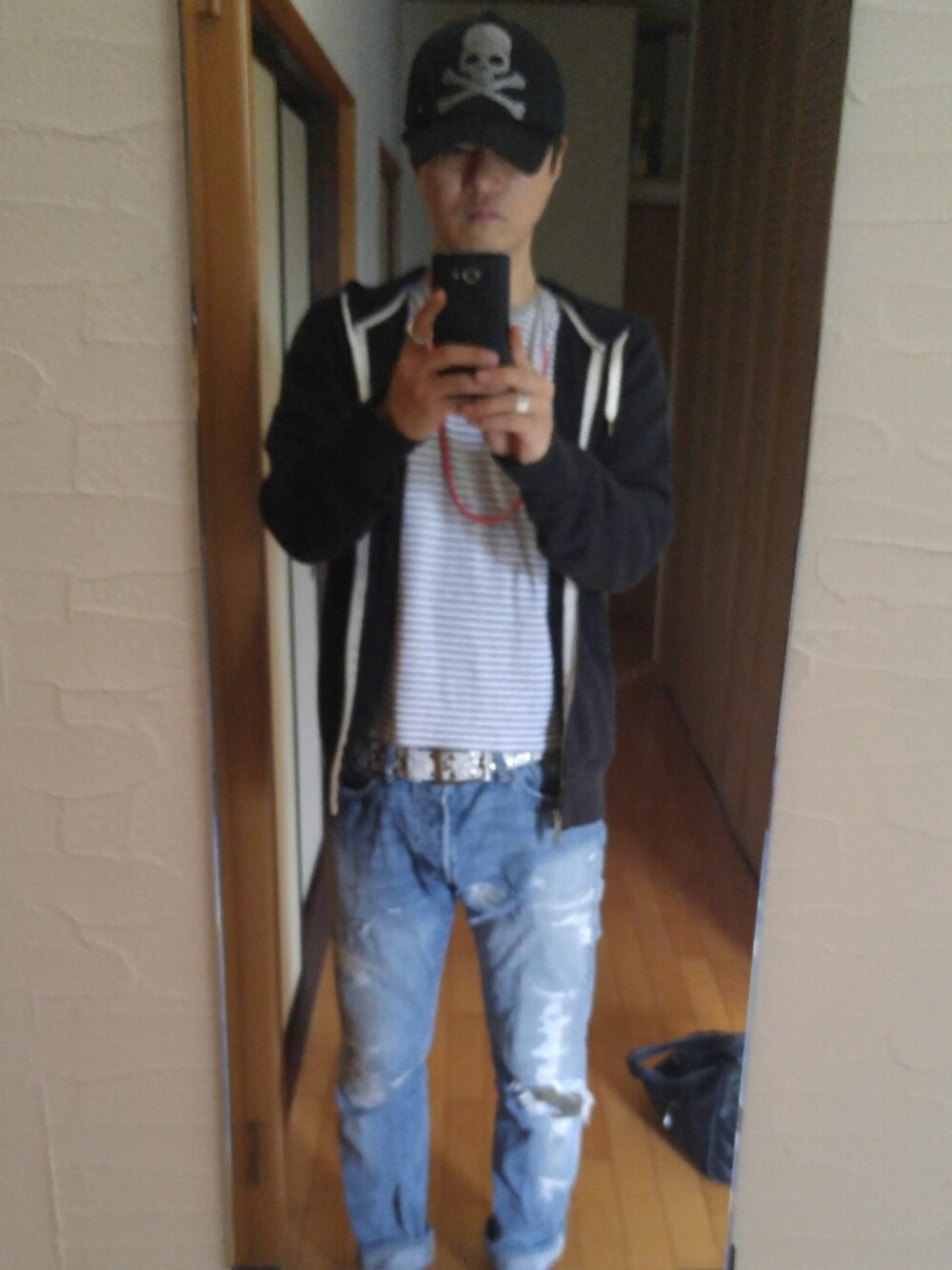 オッサンのアメカジをテーマにコーデしました! キャップとスニーカーをブラックでサンド、ネックレスと靴下をレッドで差し色に、グレーのボーダーを合わせて上品さをプラスしました 主役はキャップのスカル♪ これで全部台無し?w 女子ウケ悪そうなコーデです(^^;)