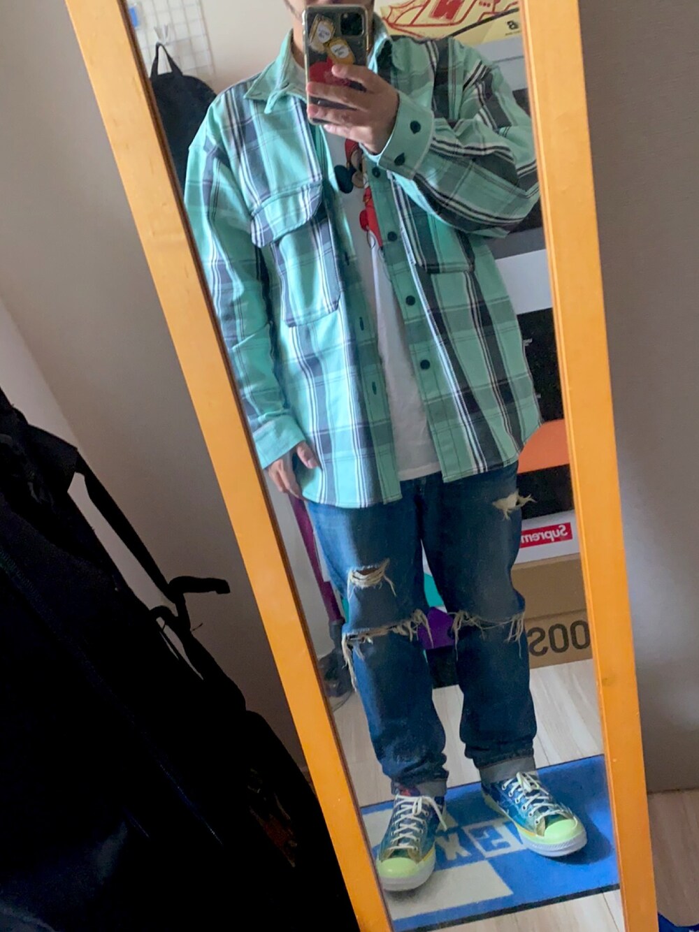 気分で全体的なミントグリーンで色合わせ。 ここにきてダメージデニム熱が再燃