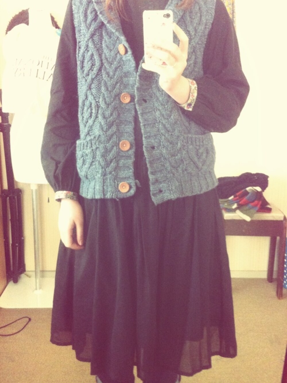ハンドメイドのワンピースにざっくりニットワンピでゆるいコーデに。 あったかいー。