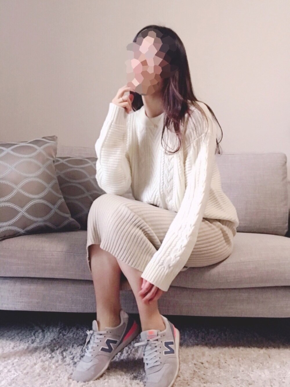 休日のゆるゆるニットコーデ* スニーカーのほんの少しのピンクが主役です! 透けるように外巻きにした髪の毛がポイントです^^