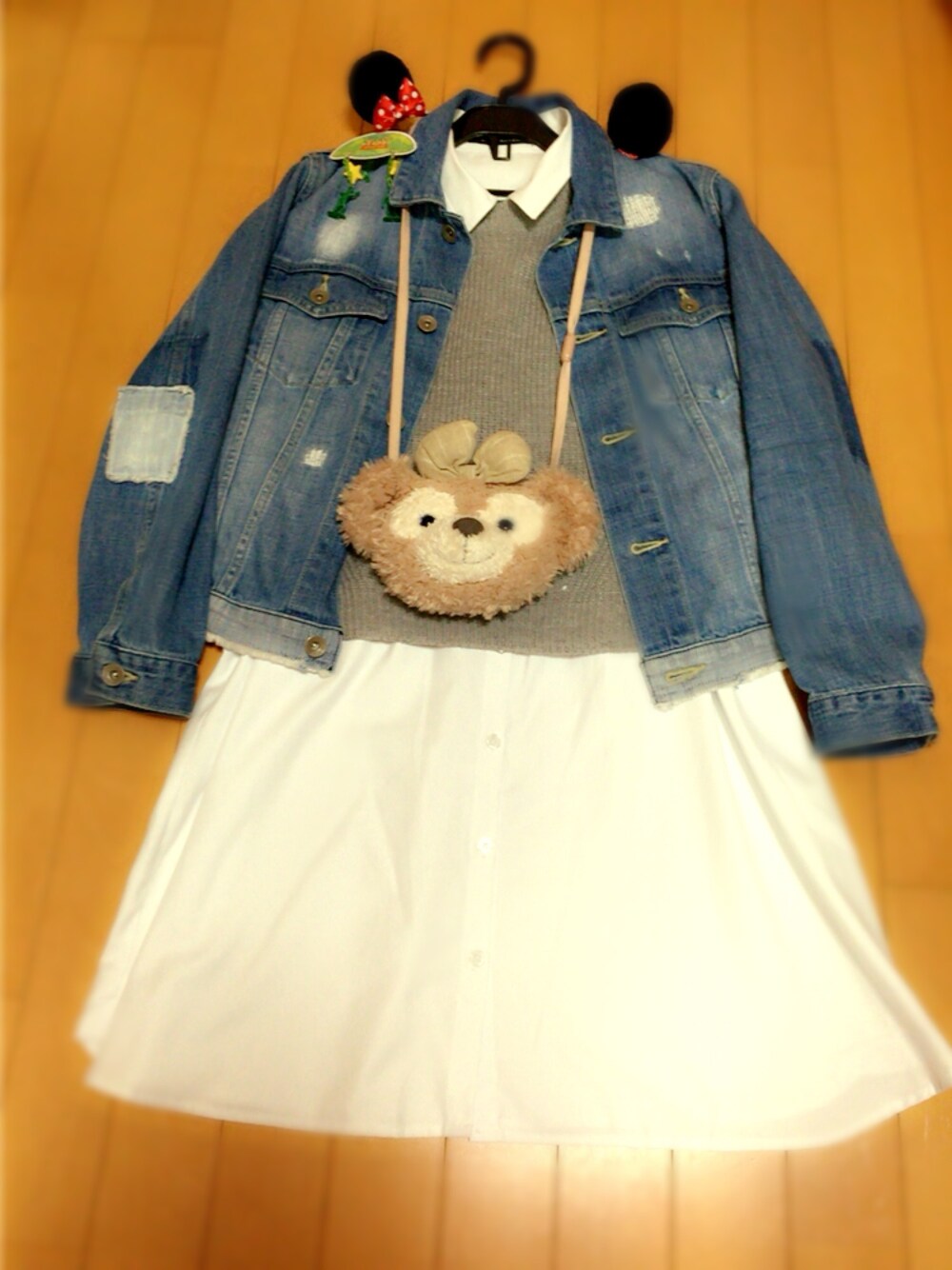 双子Disneyコーデ( ﹡ˆoˆ﹡ ) シャツワンピとニットベストはセット。中にはちゃんと白のショーパン履いてます◎ ピアスは前にディズニーで買ったグリーンアーミーメン! Gジャンはデザインが少し変わってて可愛いです☺︎