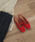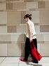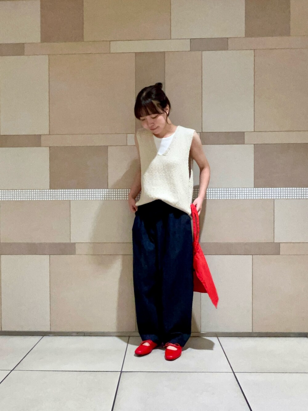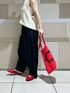 赤がワンポイントのコーデです📍 ニットのVが深めに開いているので首元がすっきりします!ニットとパンツの落ち感がとても可愛いです。