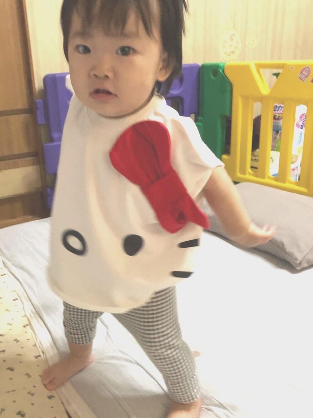今日の保育園コーデ🎶 キティちゃんの顔型の Tシャツが、 BIRTHDAYでSALEで380円だったので 即買いしました♡♡ ほんとに、顔の形そのままの Tシャツなんです!!!( °Д°)