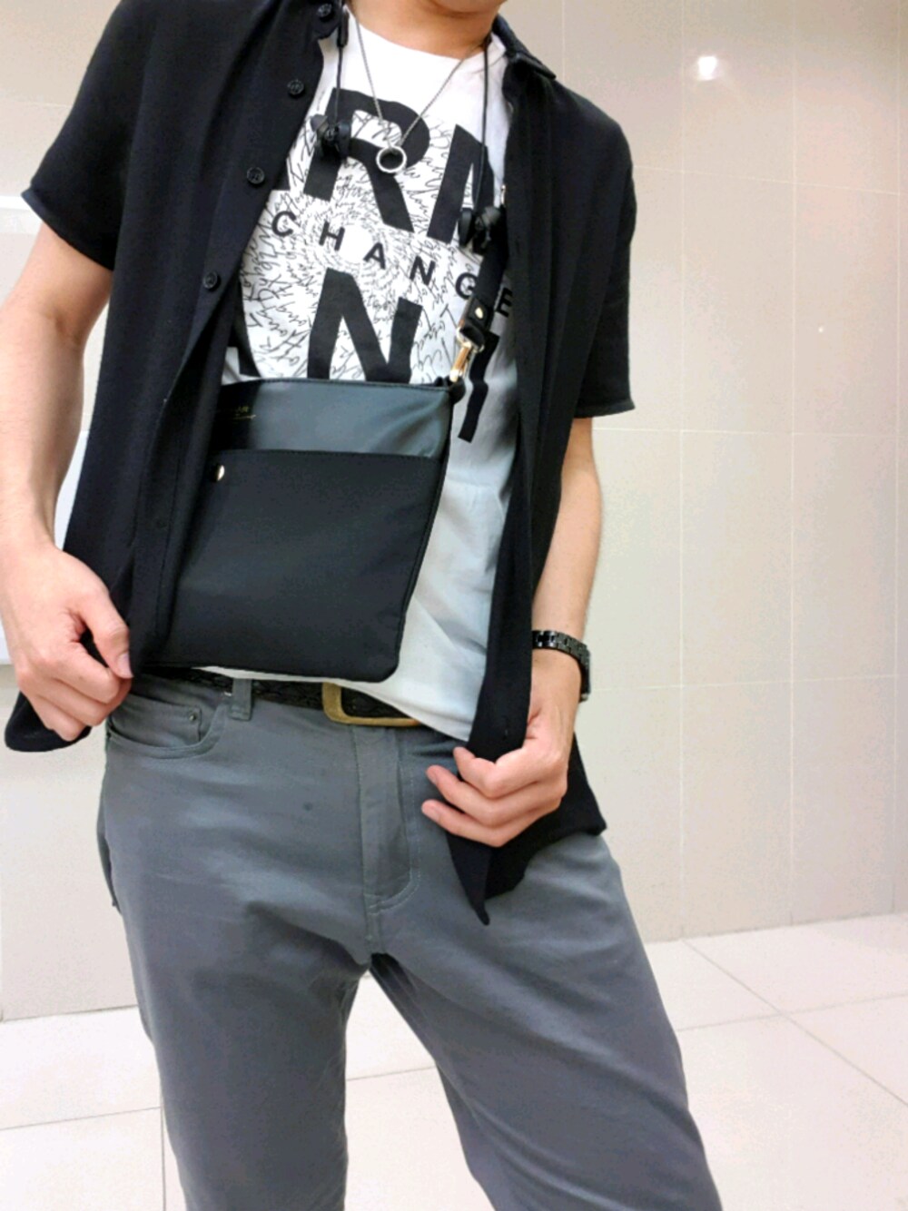 苦手なサコッシュをあえて使ってみるための今日の服装。BOSEのイヤホンがいい感じになじんでた。