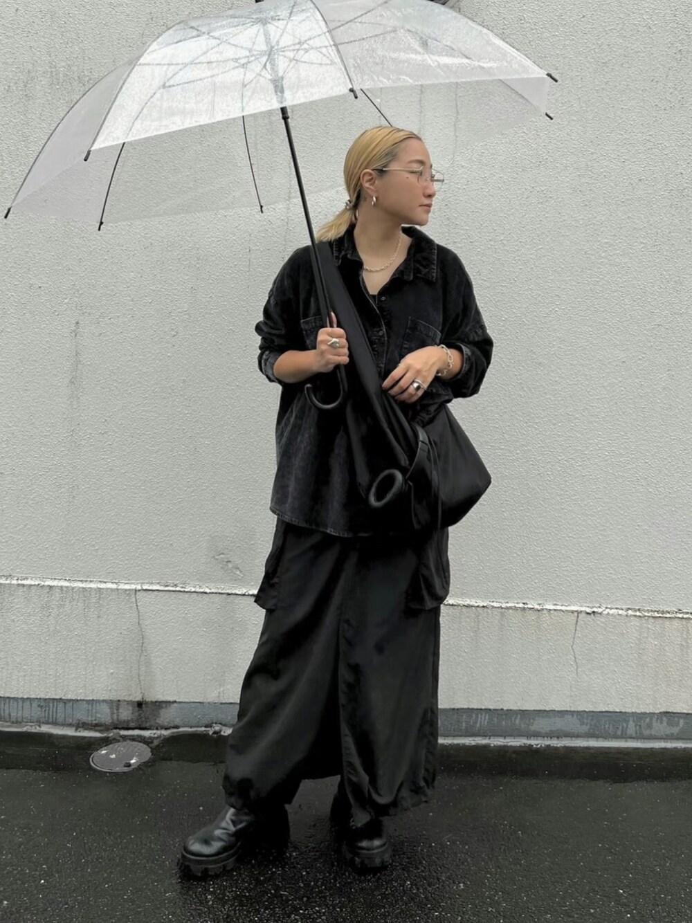 オールブラックコーデ この日は少し肌寒かったので長袖シャツを...🤍 去年買ったSLYのスカートは今年もたくさん履いてます😆
