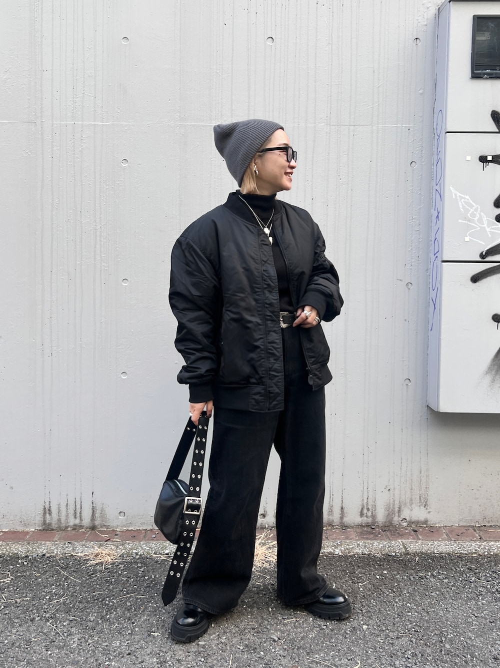 オールブラックにシルバーアクセリーをゴテゴテにつけたコーデ♡ベルトのバッグルもポイントです✨✨