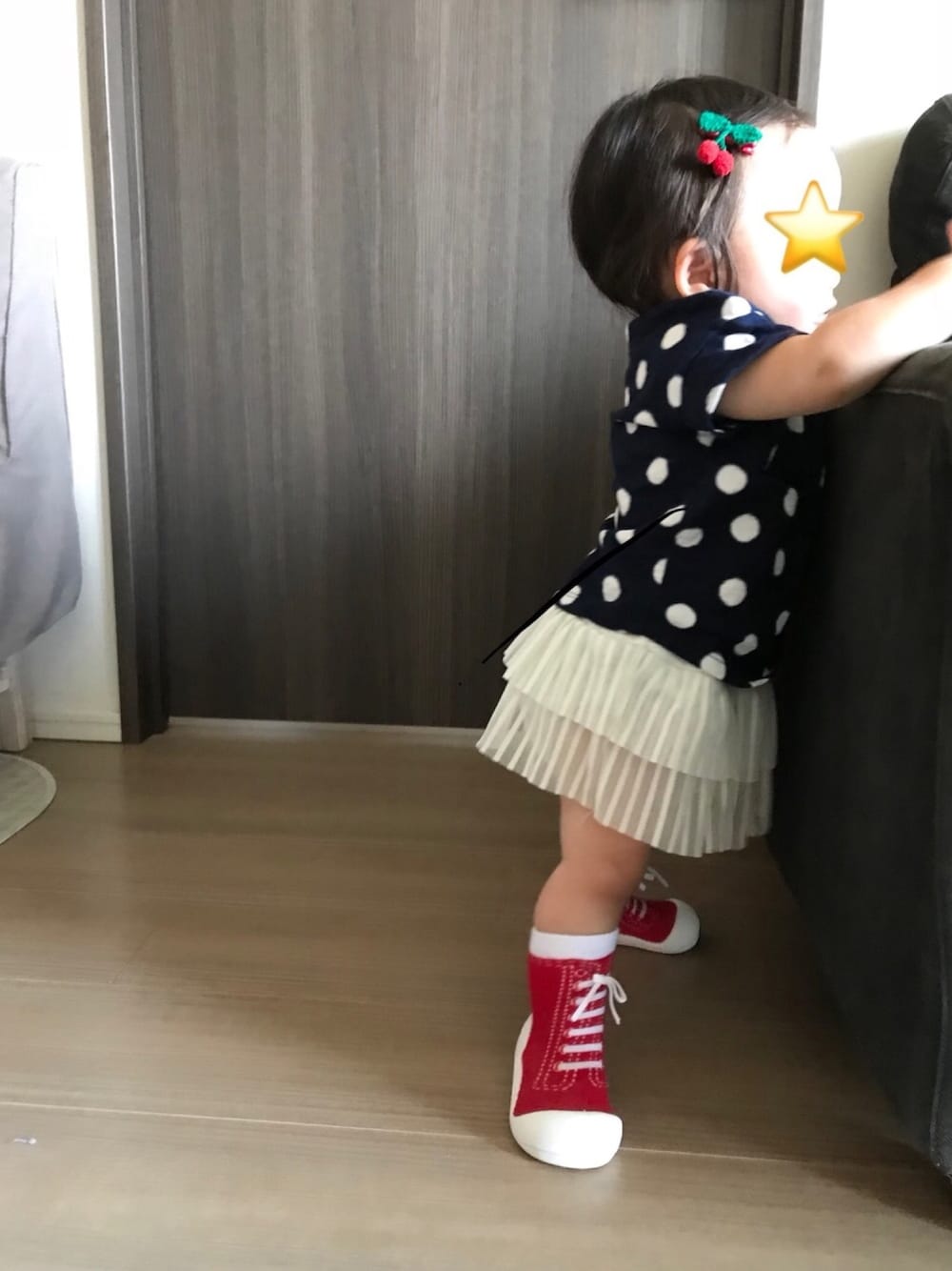 光の加減で顔が白くて怖いっっ まだひとり歩きをする気配はないけど、お店などで抱っこから降りたがる娘に、室内向けのシューズを履かせてみました。いい感じ◎