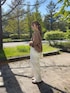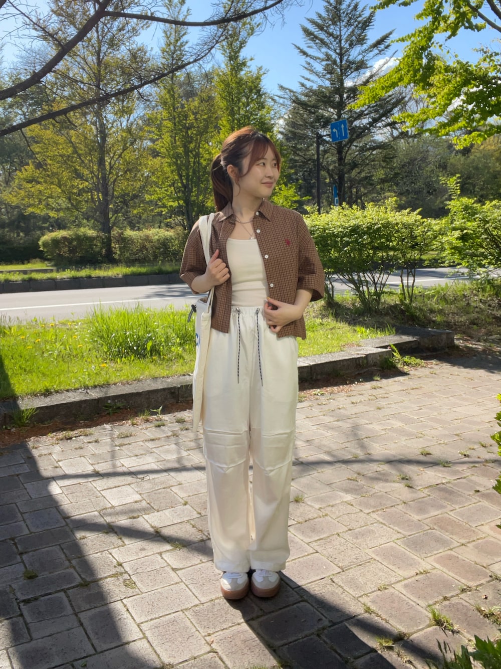 ショート丈のチェックシャツでスタイルアップしつつ、メンズライクぽいパンツを合わせて楽なコーデにしました! ウエストはゴムになっていて長時間座っていても苦しくなく、チェックシャツもサッと羽織れる為簡単でオシャレに着こなせます✨️ Instagram⇨toririn_8