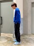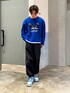 カジュアルブルーコーデ 犬ロゴのニットにナイロンパンツあわせたカジュアルコーデ組みました✌️ レイヤードスタイルで大人カジュアルに