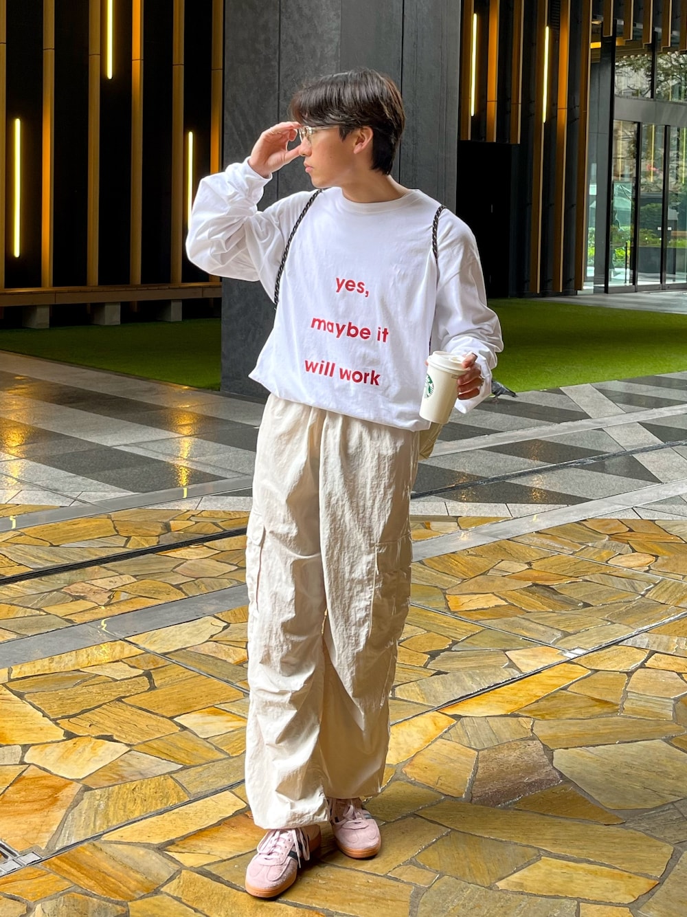 シンプルwhitecode カーゴパンツにロンT合わせたシンプルコーデ組みました✌️ 靴で差し色ピンク🍑