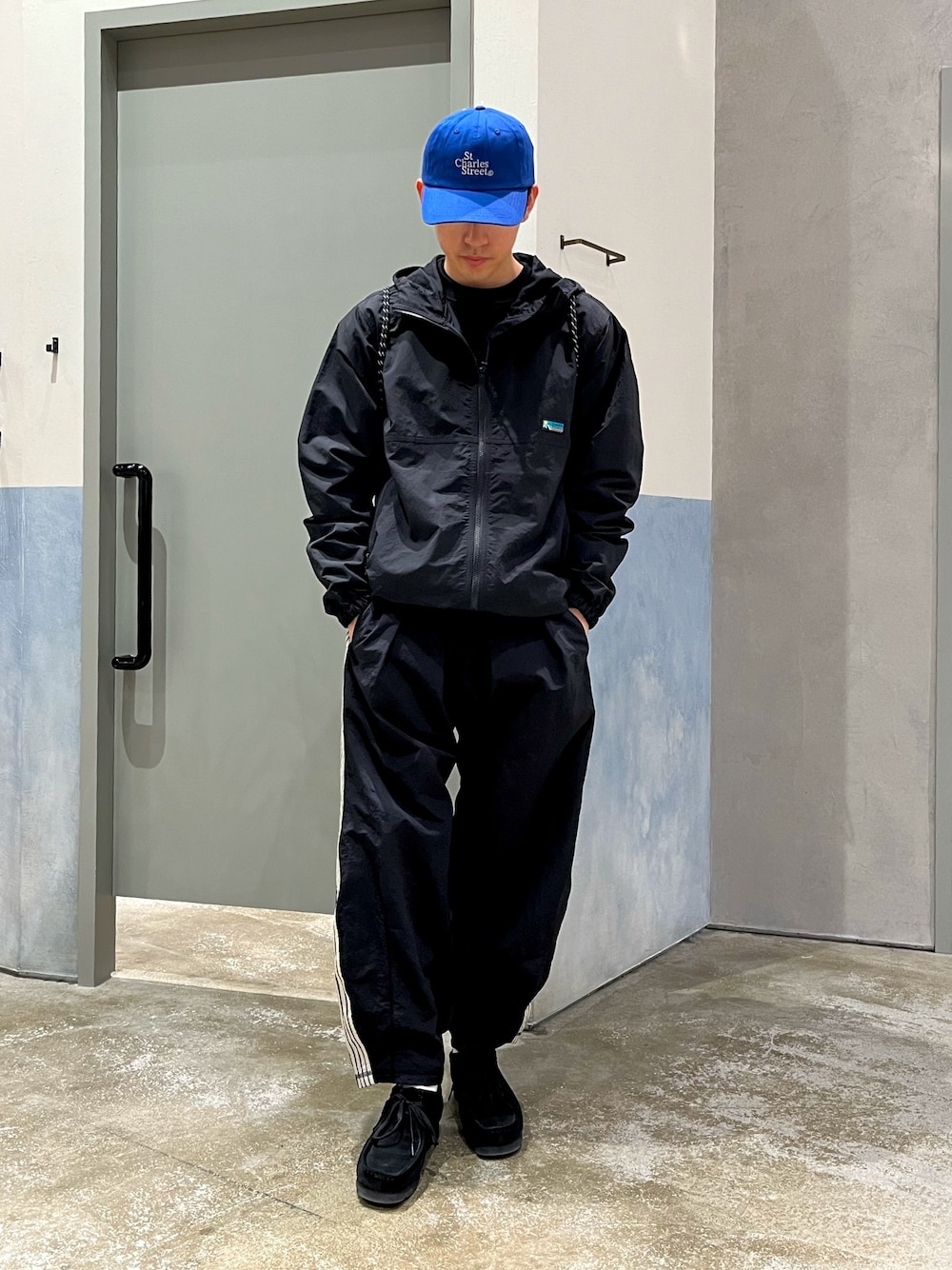 スポーツミックスコーデ マウンテンパーカーにトラックパンツ合わせなスポーツミックスコーデ🚚 春先1枚は欲しいアウターでオールブラックコーデに 差し色で青キャップ