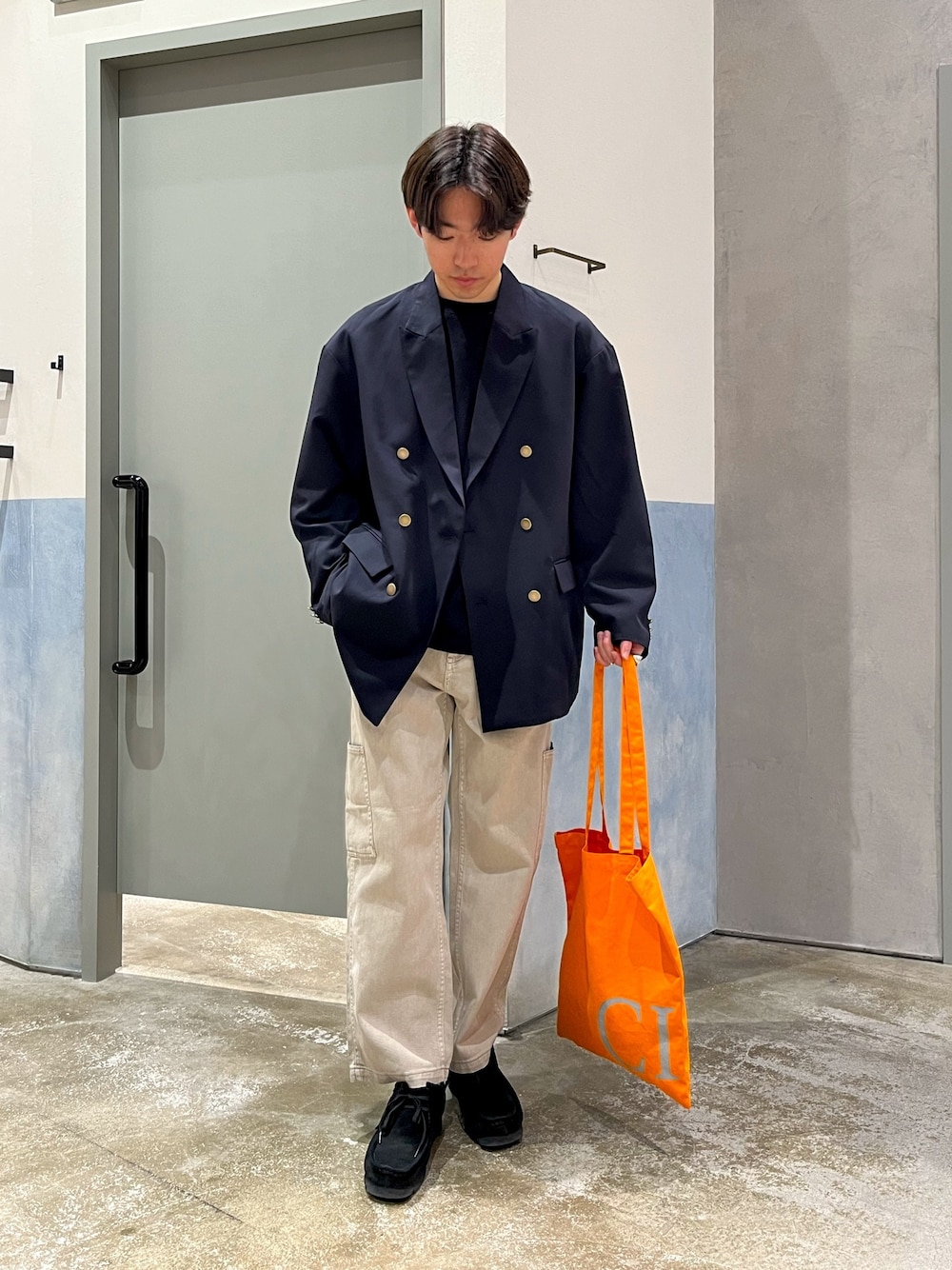差し色使った古着mixコーデ テーラードジャケットにデニムのカーゴパンツつかった古着mixコーデ組みました✌️ トートバッグで差し色🍊
