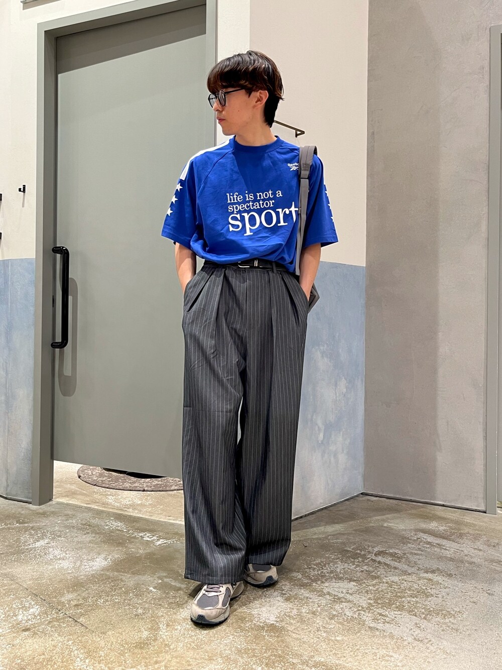 スポーツmixコーデ🐳 ReebokのロゴTにワイドスラックス合わせたシンプルスポーツmixコーデ組みました✌️ テロテロ生地のスラックス、夏でも1枚でサラッと履けます‼️ すべてユニセックスで着用可能です✨️