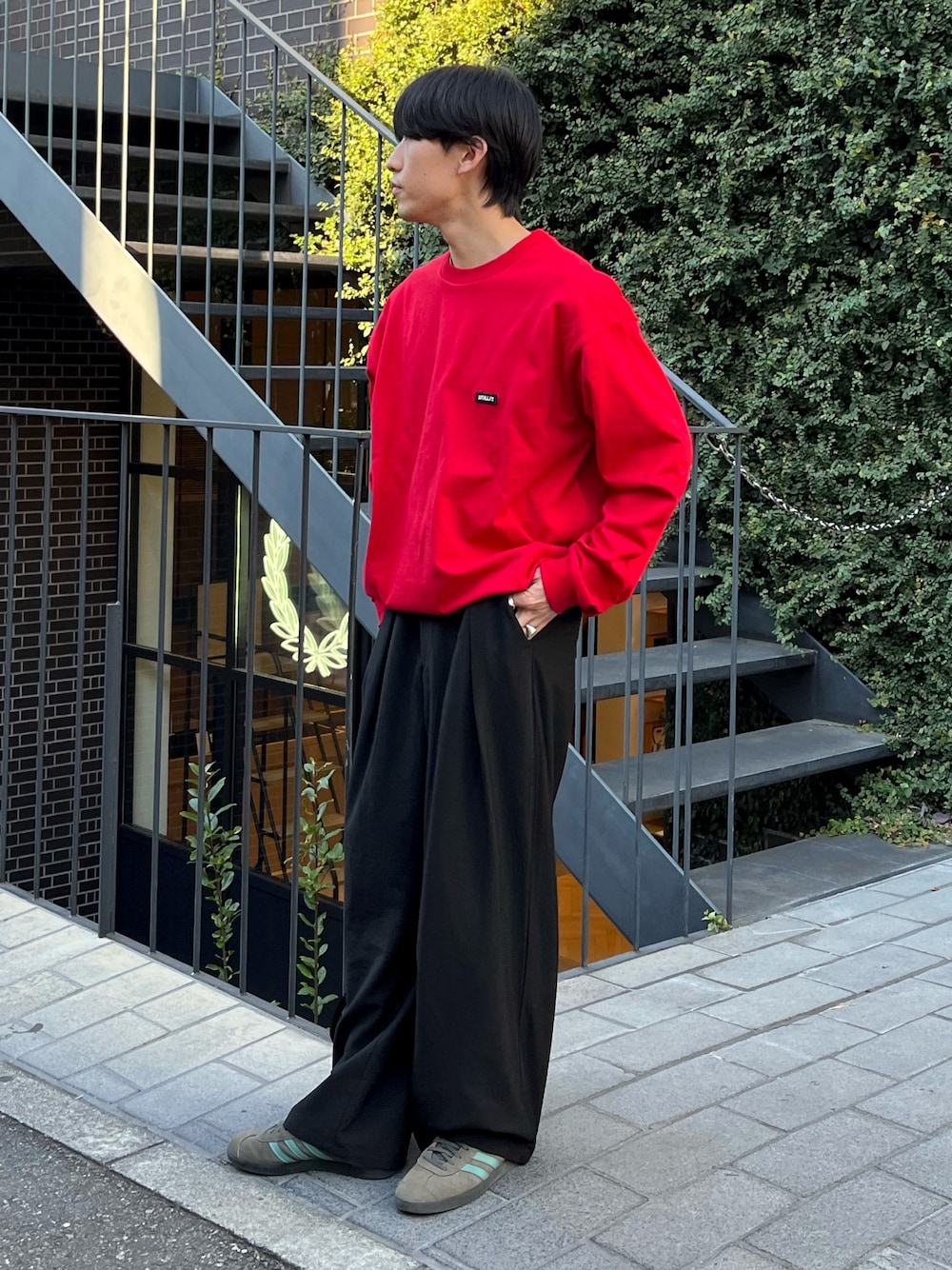 ノームコアスタイル 赤ロンTにスラックス合わせたノームコアスタイル 今の時期ならインナーにオススメです✨ すべてユニセックスで着用可能です!