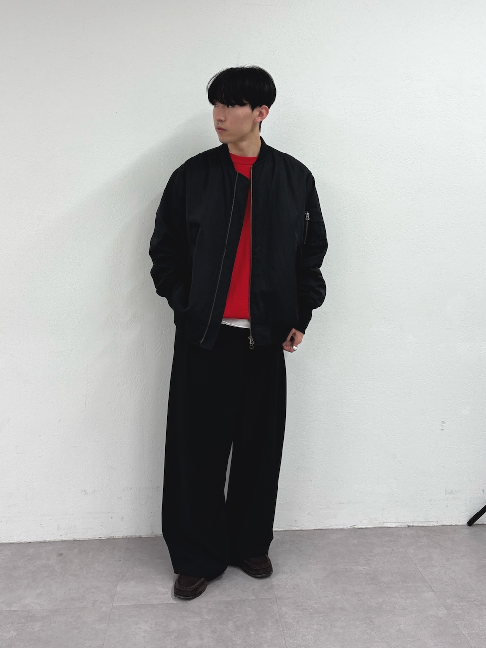 MAー1にワイドスラックス合わせたシンプルノームコアスタイル組みました✌️ MAー1は中綿入りで 凄く軽く冬も着ていただけます! インナーに赤ニットでアクセントに🍎 すべてユニセックスで着用可能です!