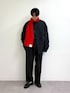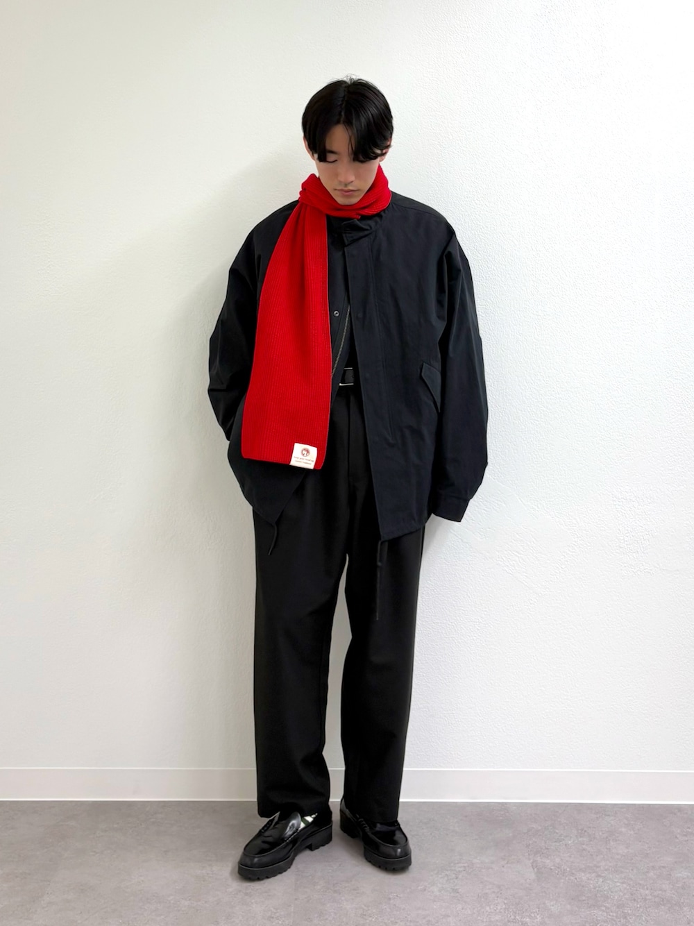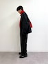 ショート丈のモッズコートにテーパードスラックス合わせたブラックコーデ組みました✌️ 差し色に赤マフラー🧣 全てユニセックスで着用可能です!
