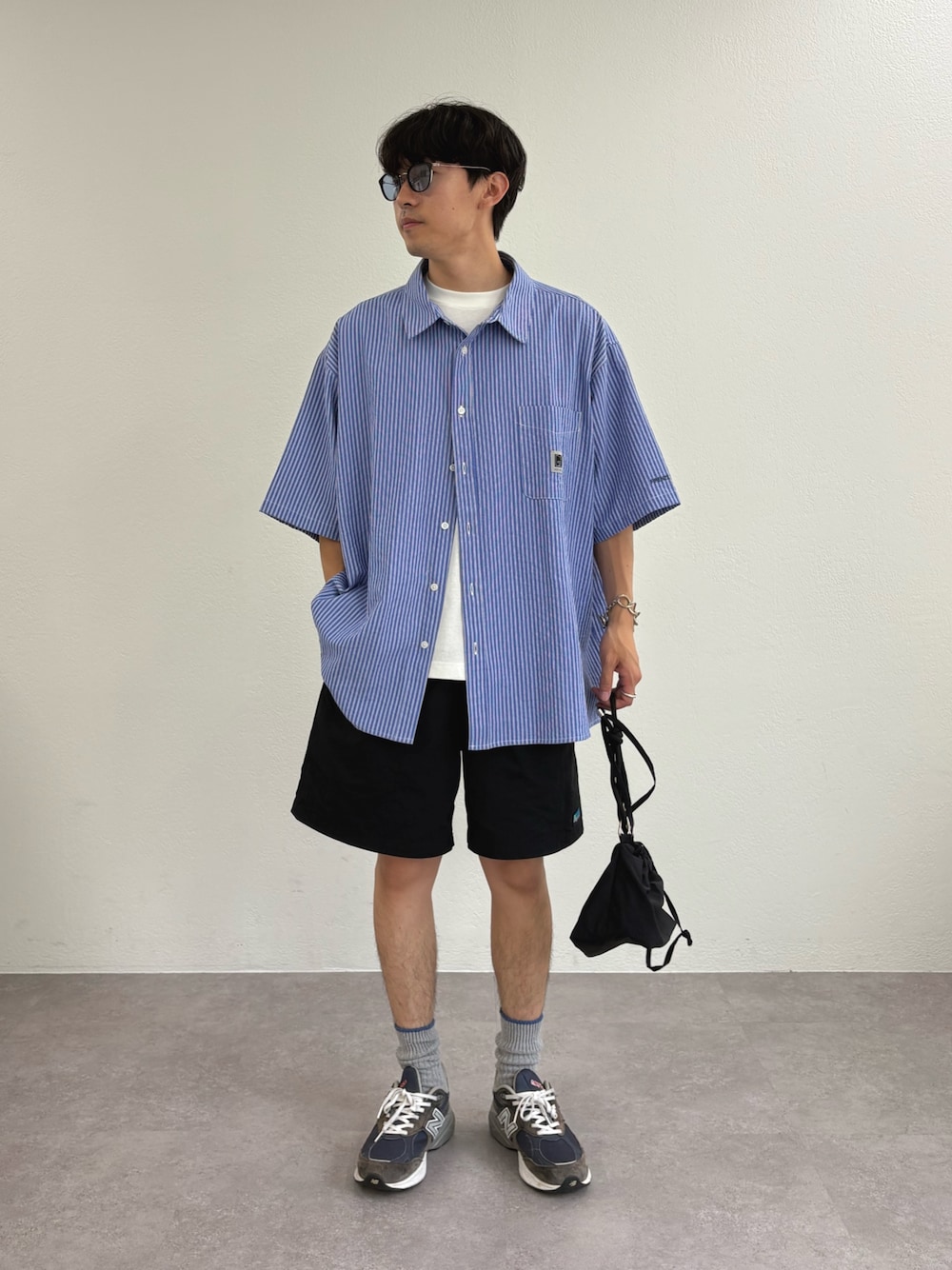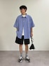 オーバーサイズのストライプシャツに水陸両用で使えるショーツ合わせたしシティースタイル! すべてユニセックスで着用可能です!