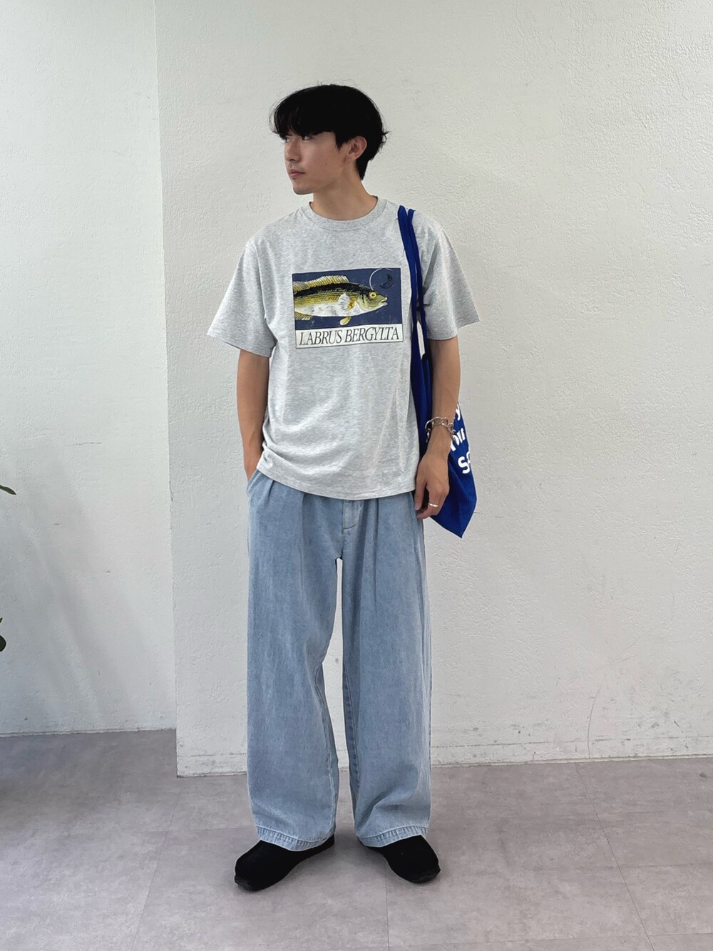 魚が可愛いプリントTに接触冷感デニム合わせた夏のシティーカジュアルスタイル組みました✌️ すべてユニセックスで着用可能です!