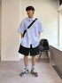 ストライプシャツにショーツ合わせたシティーカジュアルスタイル組みました✌️ すべてユニセックスで着用可能です!
