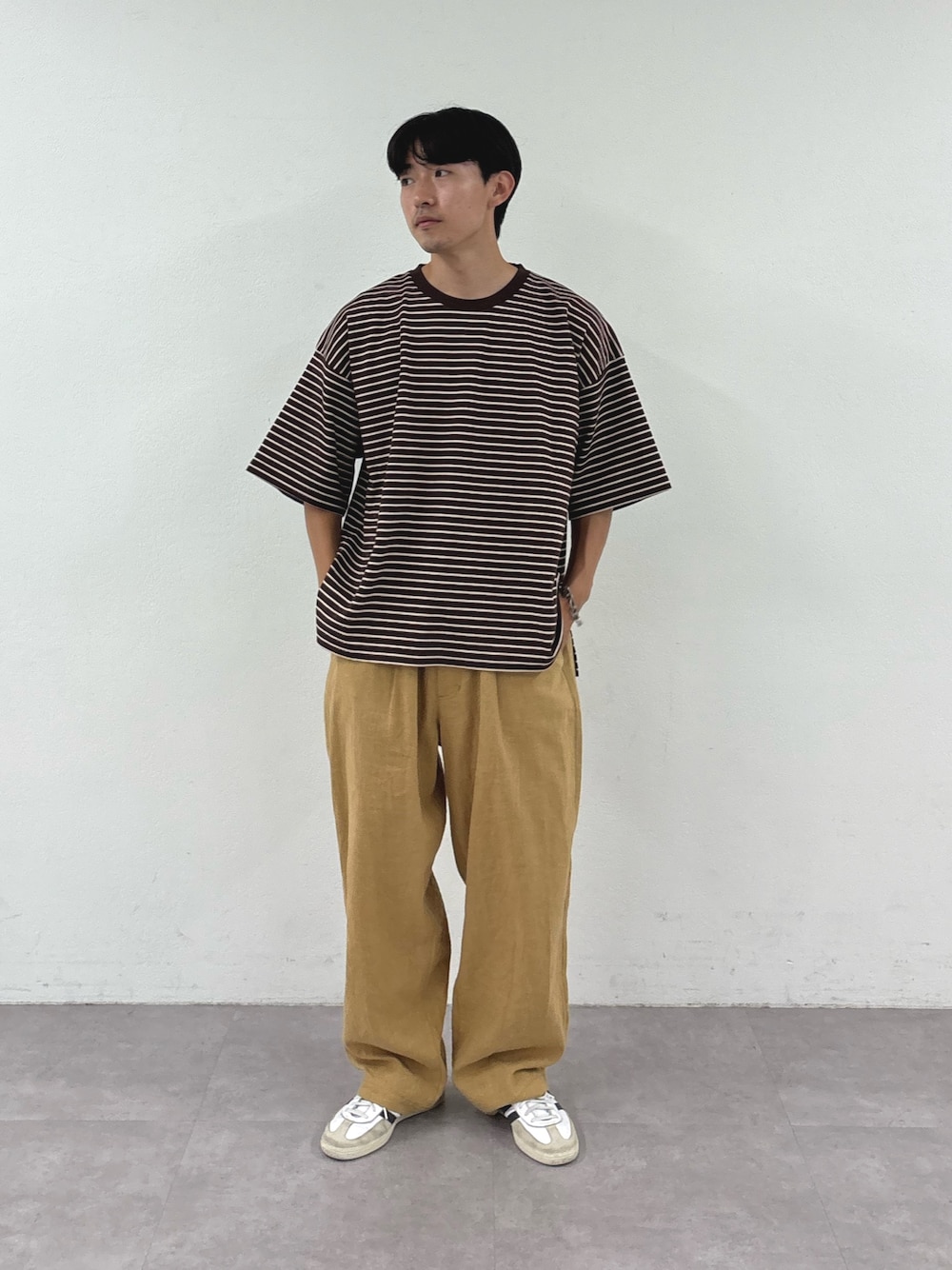 ブラウンのボーダーteeにコットンリネンパンツ合わせたカジュアルスタイル組みました✌️ すべてユニセックスで着用可能です!