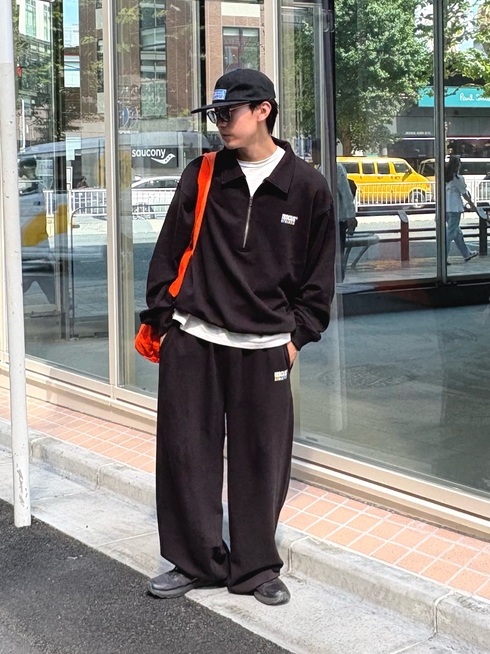 セットアップで着れるハーフジップスウェットにスウェットパンツ合わせたシンプルスタイル組みました✌️ 差し色にオレンジトート🍊