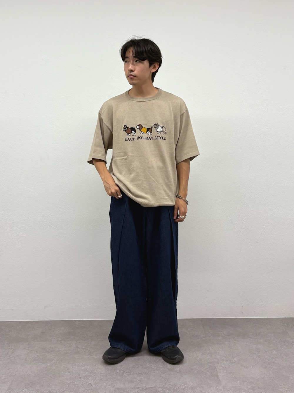 犬プリントサマーニットにタック入りのデニムパンツ合わせたシンプルスタイル組みました✌️ すべてユニセックスで着用可能!!