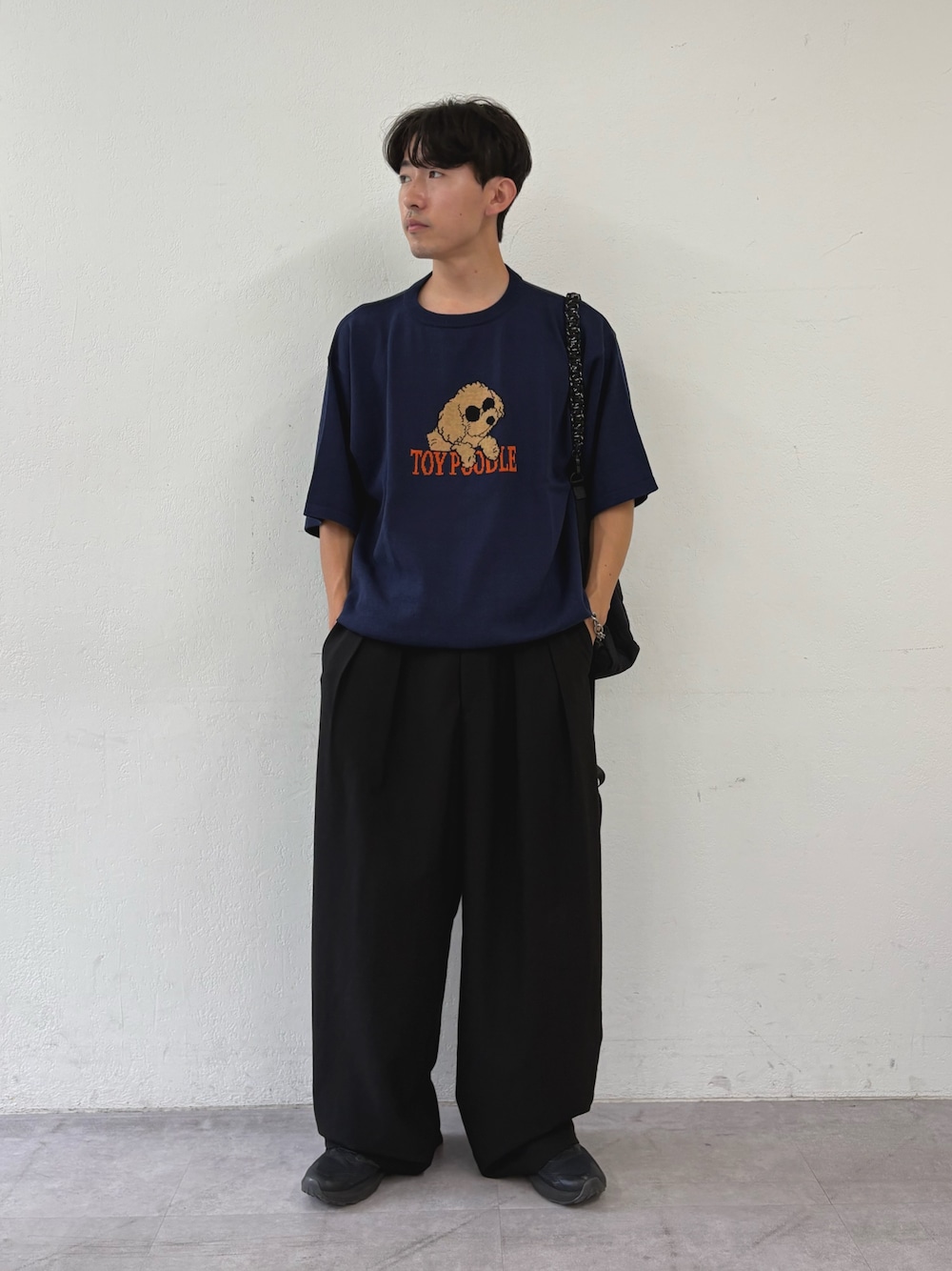 犬プリントがかわいいサマーニットにスラックス合わせたモノトーンスタイル組みました✌️ バックも3wayで使えて撥水機能付きです‼️ すべてユニセックスで着用可能!