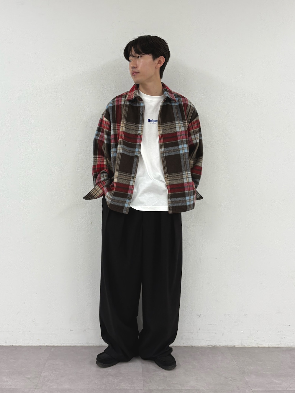 シャギーチェックシャツにワイドスラックス合わせたカジュアルスタイル組みました✌️ すべてユニセックスで着用可能です‼️