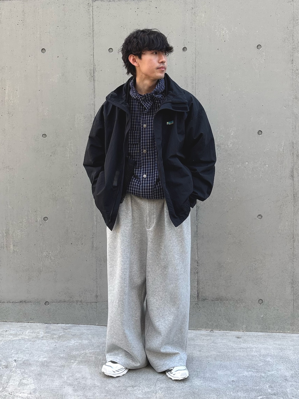 ナイロンジャケットにスウェットパンツ合わせたアウトドアMIXスタイル組みました✌️ インナーにチェックジャケット入れてカジュアルめに、 すべてユニセックスで着用可能です‼️