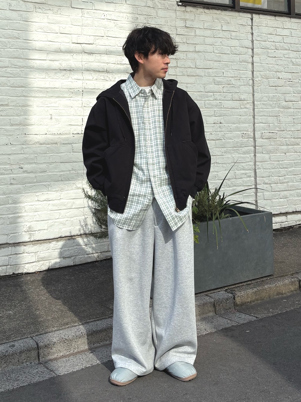 フードデニムジャケットにスウェパン合わせたカジュアルスタイル インナーにチェックシャツでカジュアルめに