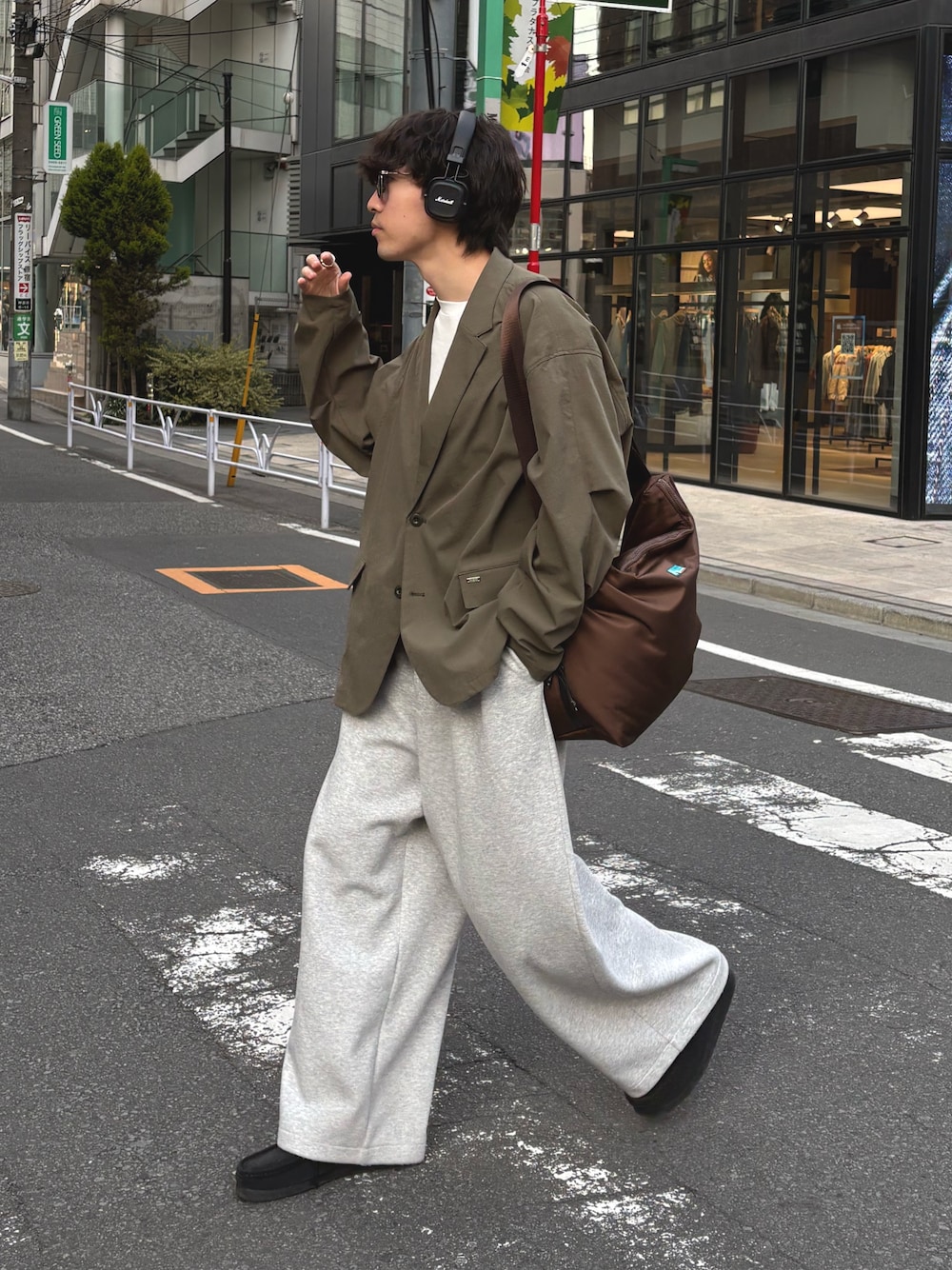 撥水性あるテーラードジャケットにスウェットパンツ合わせたキレイめカジュアル ユニセックスで着用可能です!
