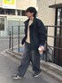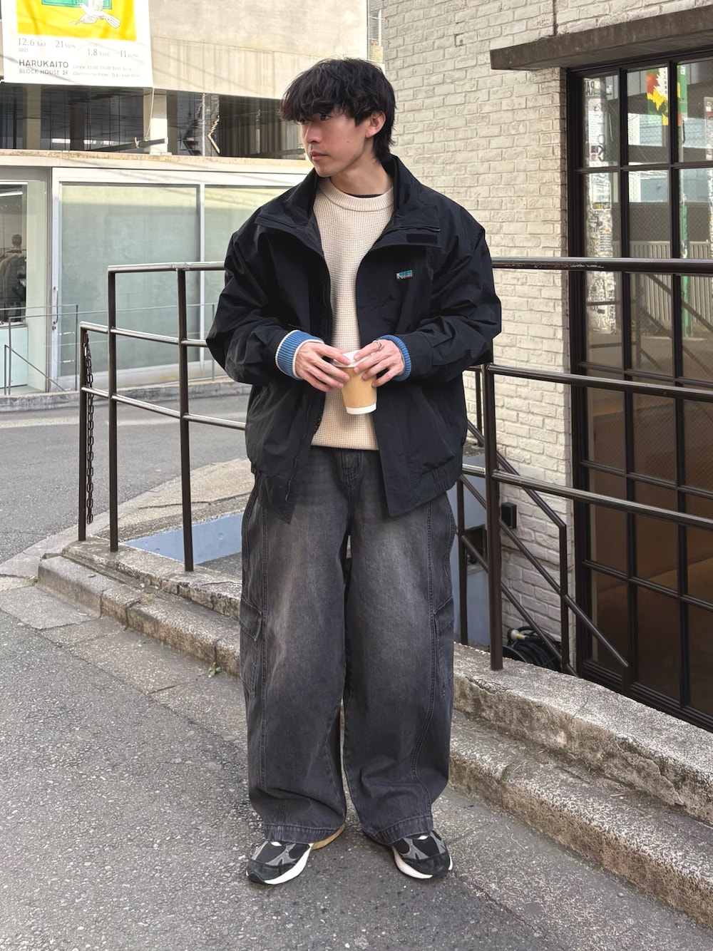 ナイロンジャケットにブラックデニム合わせたカジュアルスタイル インナーに袖配色のニットレイヤードでカジュアルめに すべてユニセックスで着用可能です‼️