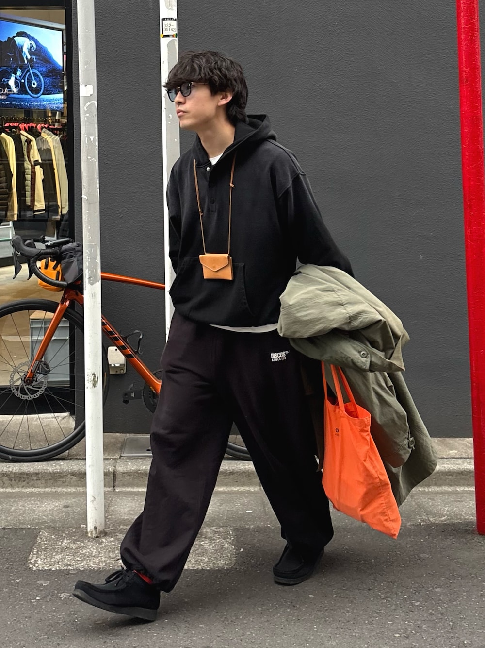 ヘンリーネックパーカーにスウェパン合わせたシティスタイル オレンジで差し色🍊