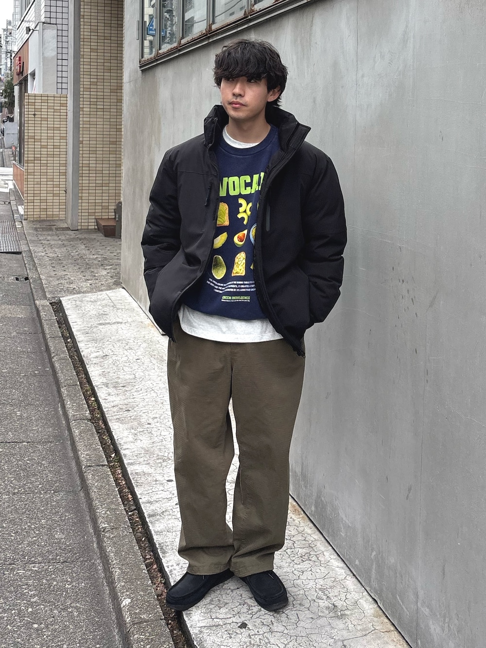 中綿ブルゾンにミリタリーパンツ合わせた冬のカジュアルスタイル インナーにアボカドスウェットでカジュアルめに すべてユニセックスで着用可能です‼️