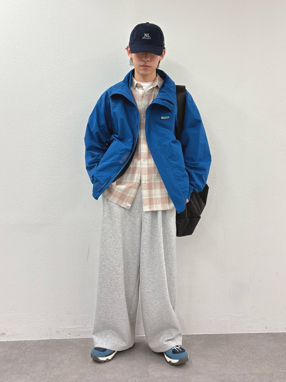 ナイロンジャケットにスウェパン合わせたカジュアルスタイル インナーにチェックシャツでカジュアルめに