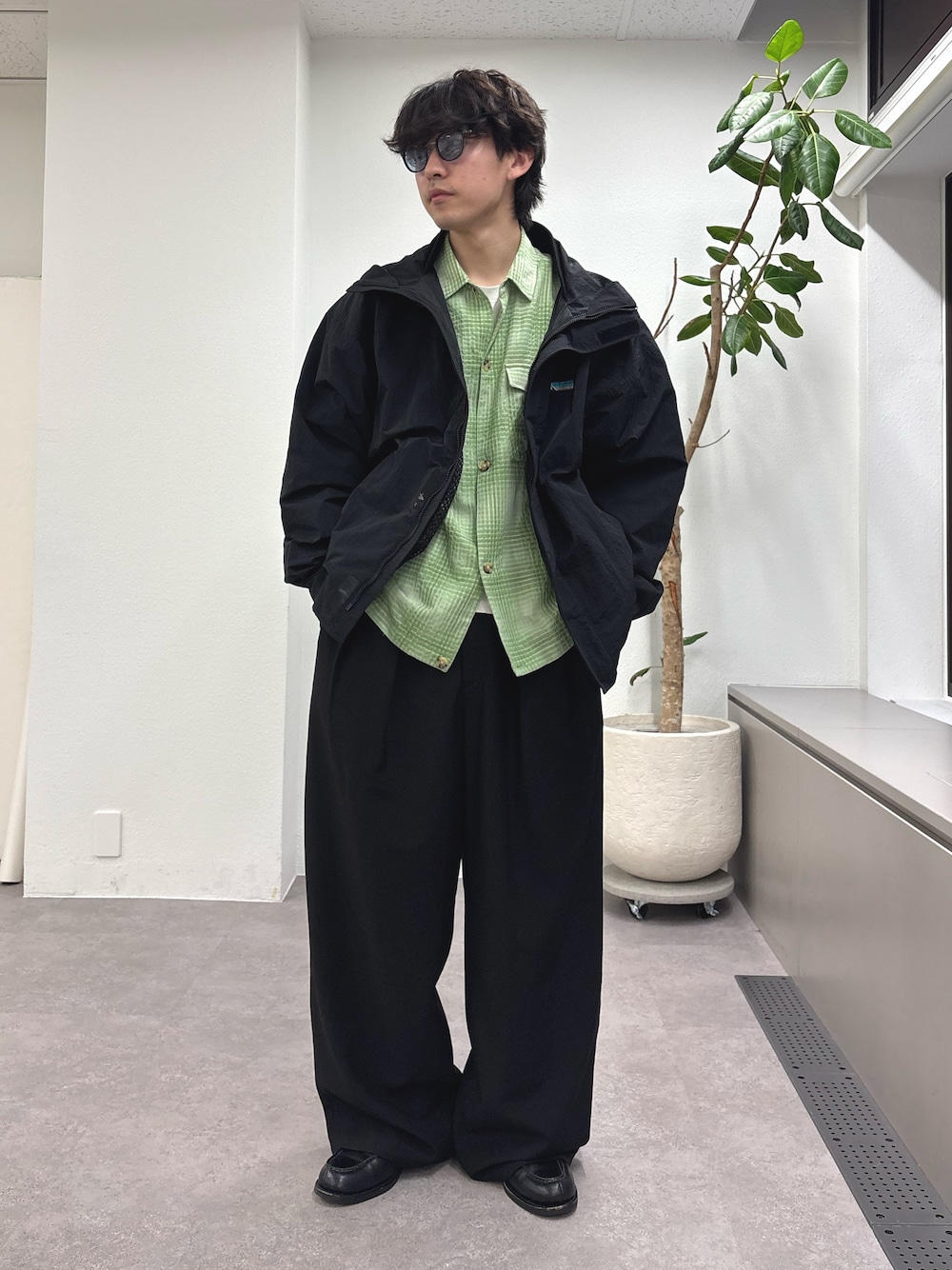 ナイロンジャケットにスラックス合わせたシンプルカジュアルスタイル組みました✌️ インナーにシアサッカーチェックシャツ合わせて差し色コーデ🟢 すべてユニセックスで着用可能!
