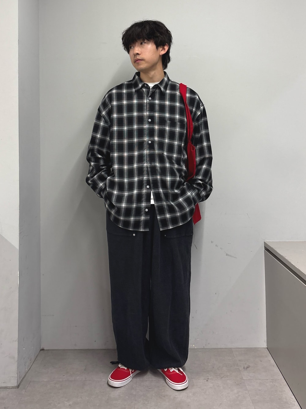 チェックシャツにワッフルパンツ合わせたモノトーンスタイル組みました✌️ 差し色に赤でアクセント🍎 すべてユニセックスで着用可能です‼️