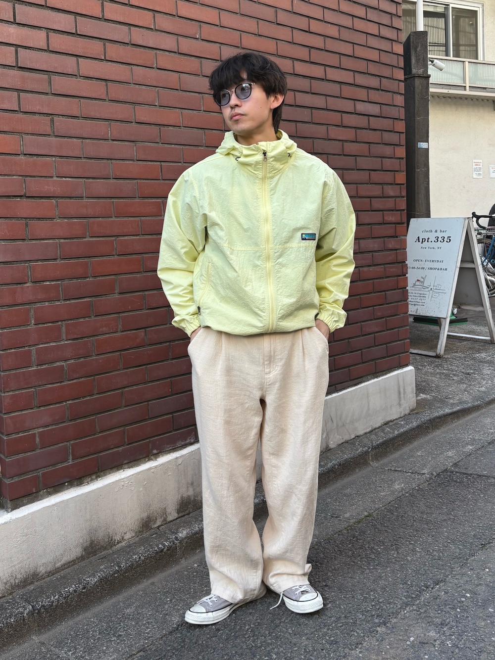 イエローのマウンテンパーカーにホワイトパンツ合わせた春コーデ組みました✌️ すべてユニセックスで着用可能です‼️