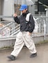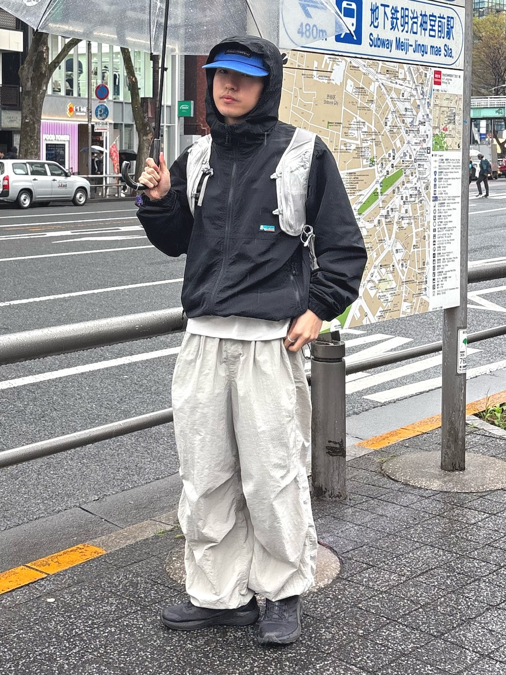 マウンテンパーカーにナイロンパンツ合わせた雨の日コーデ☔️ 差し色でアクセントも