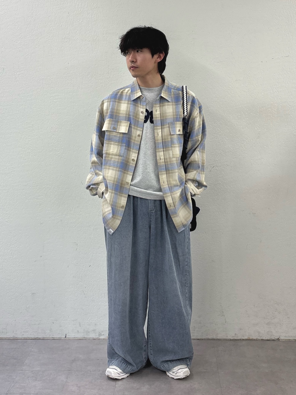 チェックシャツにデニムパンツ合わせた春コーデ組みました✌️ インナーにロゴTでカジュアルめに すべてユニセックスで着用可能です‼️