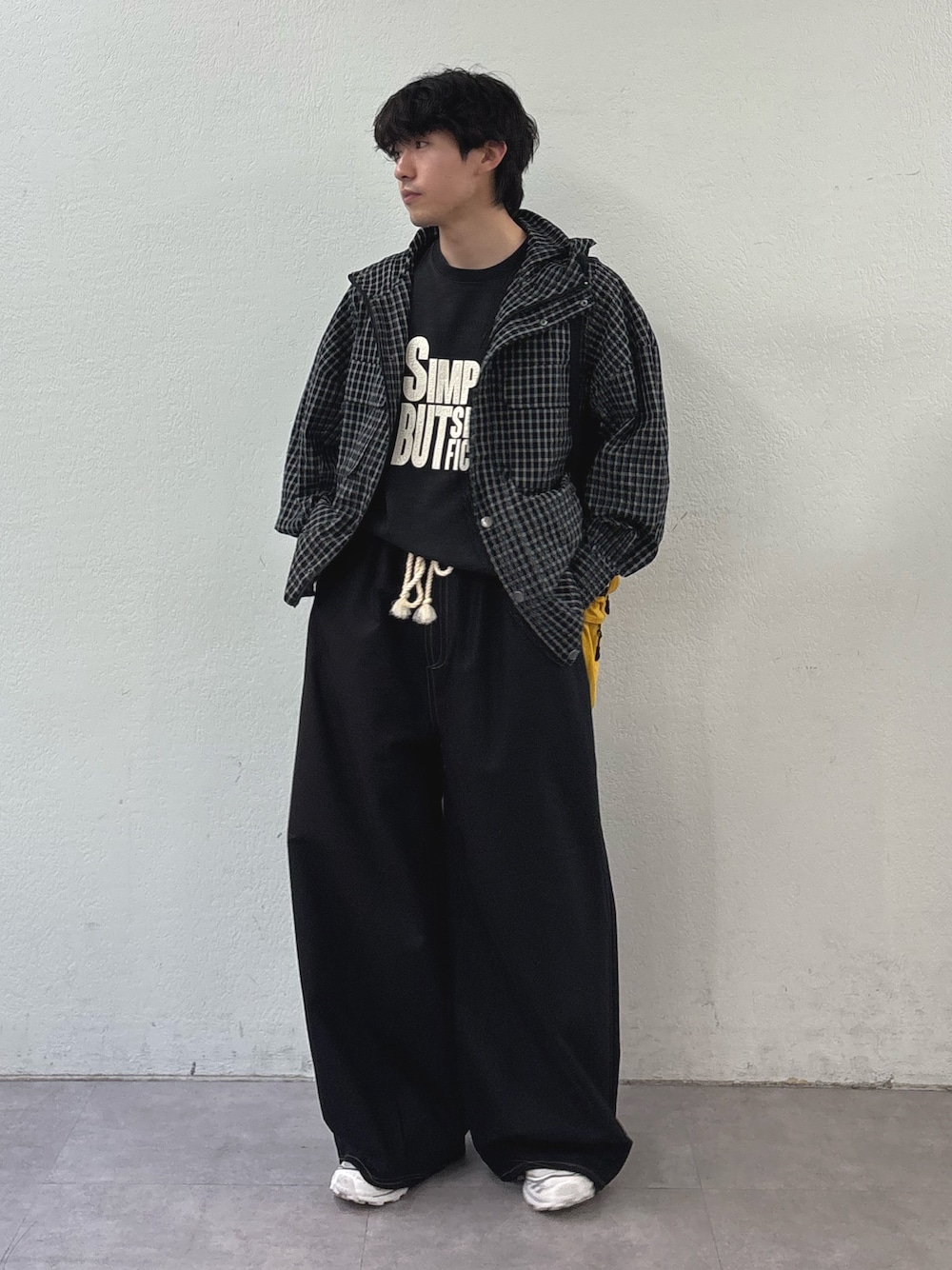 チェックジャケットにワイドバルーンパンツ合わせたブラックコーデ組みました✌️ インナーにロゴTでカジュアルめに すべてユニセックスで着用可能です‼️