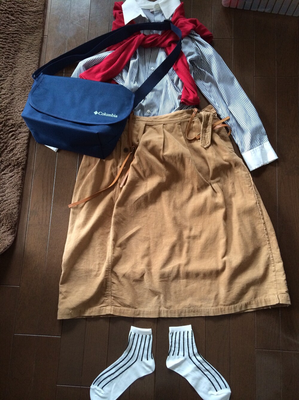 Shirts: UNIQLO Cardigan: LOWRYS FARM Long skirt : シャンブルドゥシャーム (多分) Socks: tutu anna Bag: Columbia (義父からのプレゼント♡) 結局寒くて、コートはおりました。