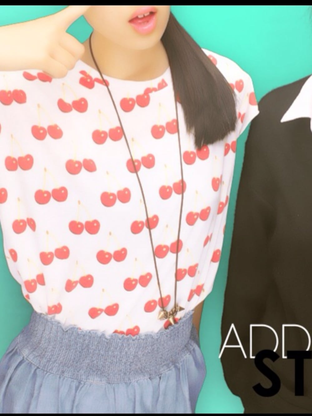 はやりのチェリー🍒がたくさんのトップスに、夏らしい軽い着心地のデニムスカートを合わせました!スカートはウエストの幅が広いのでハイウエストに着るのもいいなと思いました😋