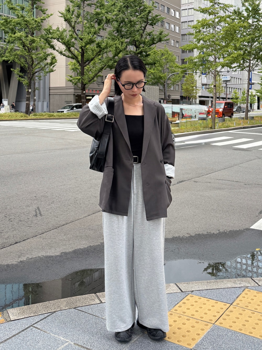 部屋着っぽく見えてしまう悩みが多いスウェットパンツもジャケットと合わせるとバランス良く◎