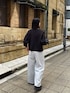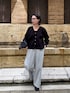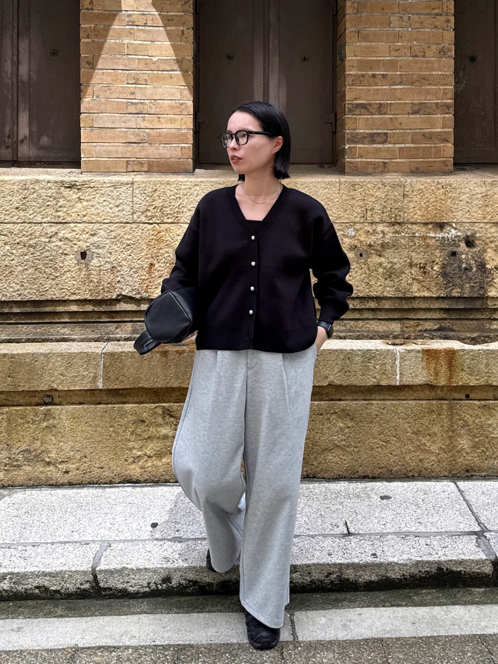 シルバーのボタンが可愛いカーディガンにスウェットパンツを合わせた綺麗めカジュアルコーデ◎