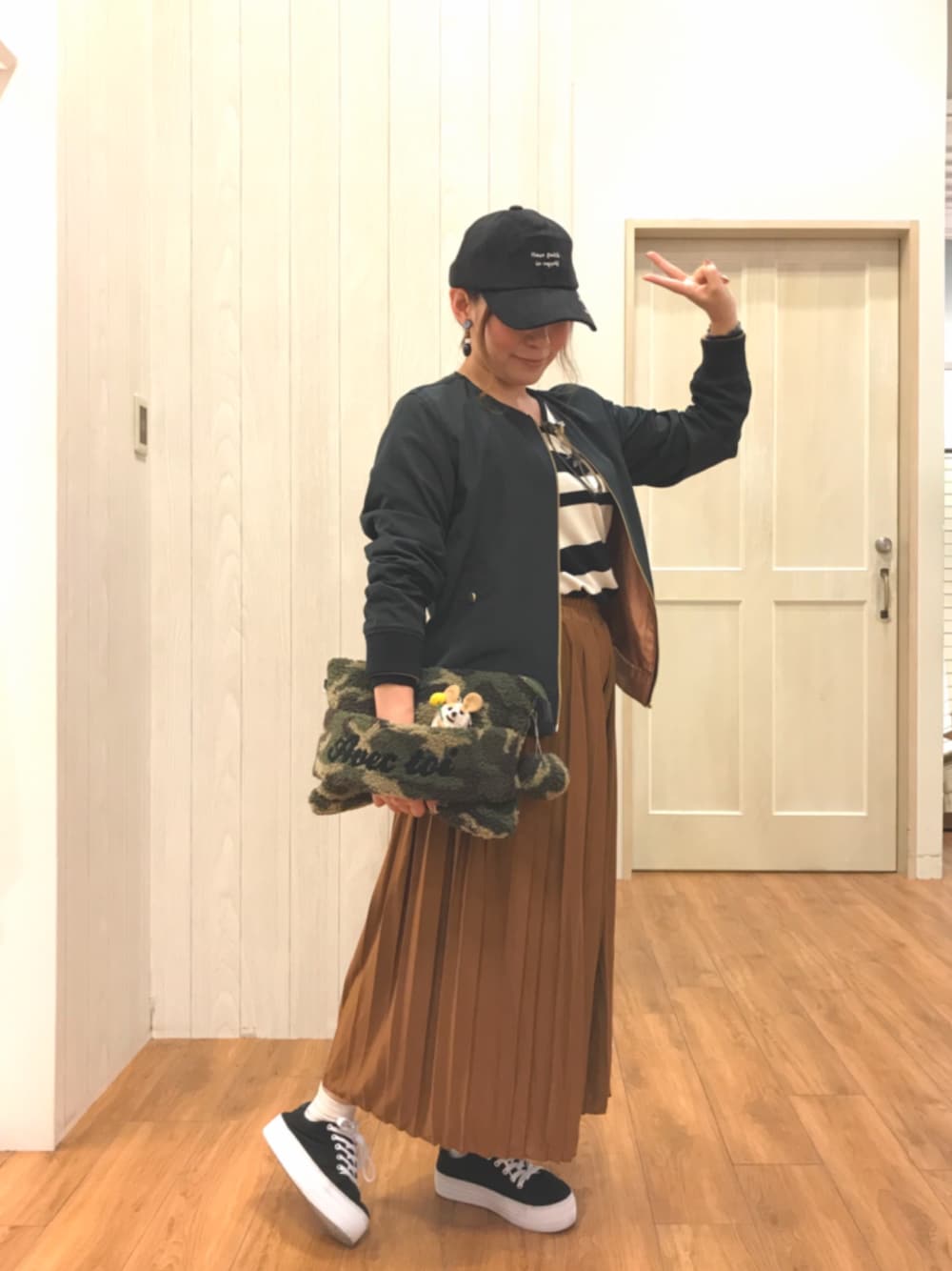こんにちは(*ˊ˘ˋ*) ご覧いただきありがとうございます😊 いいね♡お気に入り、フォローもめっちゃ嬉しいです😆 覗いてくださる方も(๑ˊ͈ ꇴ ˋ͈)ᵃʳⁱᵍᵃᵗᵒ〜♡॰ॱ 最近、ベレー帽ばっかりになってたので、 今回はキャップで大人カジュアルコーデ にしてみました😊 少し捻りを加えてサオポーに✌️ 入院中のSAOさんにエールを❣️❣️ ブラック×キャメルで大人っぽく、カモフラのモコモコクラッチをポイントしました😆 ジャケットは新作ですが、リバーシブルになってて2wayで楽しめます✌️ スカンツは昨日の紹介した、裾くるっスカンツのイロチです😊👍 トイレや家事のときに裾をクルクルって簡単に上げられます~❣️ 画期的∑(°口°๑)❢❢ そろそろ… お気づきだろうか…(←出たー🤣🤣) クラッチのスキマにフレデリックがいることを❣️❣️ スポッとはまりました😆 ジャケットやトップスは掲載が無かったので、また更新しますね😊✋ よかったらいいね♡お気に入り、フォローも気軽にポチッ押して頂けると嬉しいです (৹ᵒ̴̶̷᷄﹏ᵒ̴̶̷᷅৹)♡♡ 最後までご覧いただきありがとうございました😊