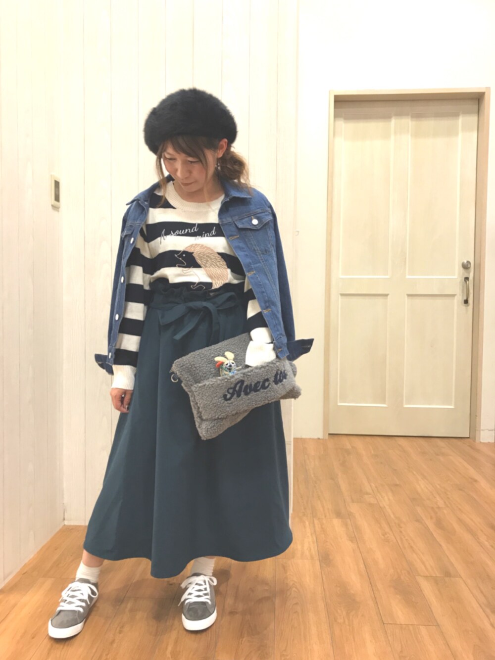 こんにちは(*ˊ˘ˋ*) ご覧いただきありがとうございます😆 いいね♡お気に入り、フォローもめっちゃ嬉しいです❣️ 覗いて下さる方も(✿´꒳`)ノ°+.*ᵗᑋᵃᐢᵏ ᵞᵒᵘ ¨̮ 3連休も最終日ですが、皆さんいかがお過ごしですか😆⁉️ 運動会のとこも多かったみたいですね😁 お疲れ様でした❣️ 私は当たり前なんですが、お仕事です😂 昨日は館のイベントで、クリス・ハートが来てました❣️ 見には行けなかったですが、歌声はバッチリ聞こえ、癒されました😆🎶 田舎なので、芸能人が来るとファンじゃないけどウキウキします(笑) はい…ミーハーです🤣 あ、フォロワーさんが400人超えてました😆🎶 ありがとうございます😁➰💗 嬉しいです😆⤴︎︎︎⤴︎︎ タイムラインとか、コメントとか遅くなることもあるけど、みんなと絡むの楽しい😍💗 これからもよろしくです٩(ˊᗜˋ*)و 遅くなりましたが、コーデです😁 デニジャケを肩がけしてみました✌️ ←このままはお仕事出来ないですが😂 ハリネズミが付いたボーダーのニットとスニーカーでカジュアルな感じに🎶 スカートとベレー帽、ふわもこのクラッチで可愛さを出してみました💗 スカートは裏がブラックのリバーシブルです👍✨ お気づきだろうか⁉️←はい、久しぶりに(笑) リバティ柄のフレデリックが覗いてることを➰😆✋ シューラルーとコラボシリーズです❣️ またよかったら、いいね♡お気に入り、フォローなどポチッと押して頂けると嬉しいです❣️❣️ 最後までご覧いただきありがとうございました😆✌️