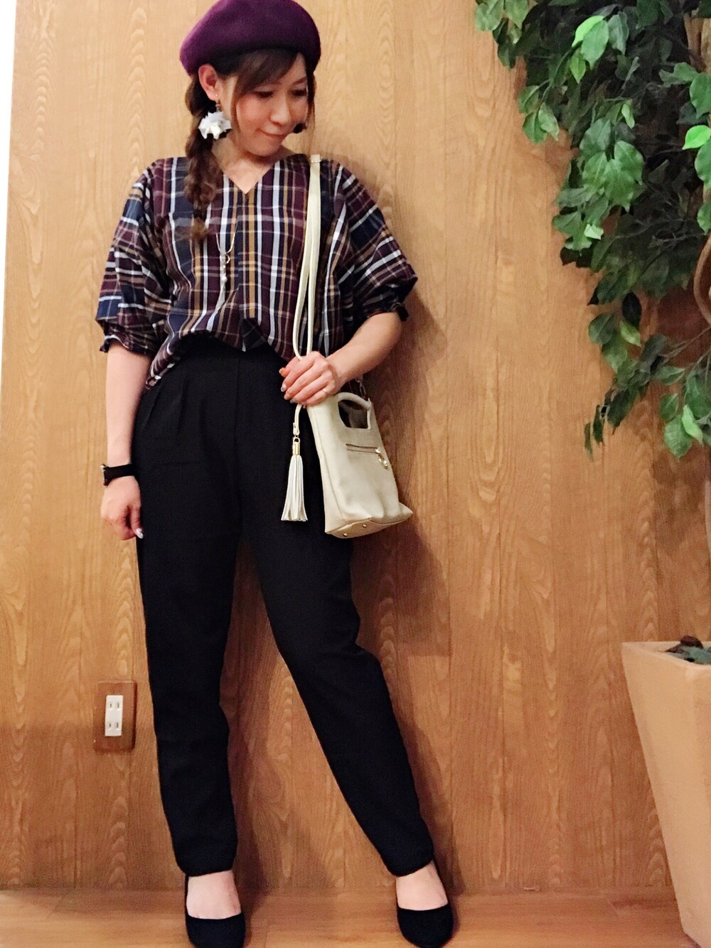 こんにちは(◍˃̶ᗜ˂̶◍)ノ" ご覧頂きありがとうございます♡♡ いいね♡お気に入り、フォローもめっちゃ嬉しいです😆🙌🙌 覗いて下さって(๑ˊ͈ ꇴ ˋ͈)ᵃʳⁱᵍᵃᵗᵒ〜♡॰ॱ 今日で8月も終わりですね😳 台風もきてるし、お天気が微妙ですが、 気を取り直して秋コーデ🍁 お袖のほわっとしたボリュームと秋カラーのチェックが可愛いブラウス💕 タックが入ってシルエットがますますキレイになったテーパードパンツと合わせました😆✌️ パープルのジャイ子帽に楽ちんパンプスで図書館デートとか出来そうな読書の秋🍁をイメージしてみました😊 ではでは♡ 8月もご覧頂きありがとうございました♡♡ タイムラインも回れてなかったり、ポチばかりでごめんなさい🙏💦 少しずつ遊びに行くので 9月も宜しくお願いします♡♡