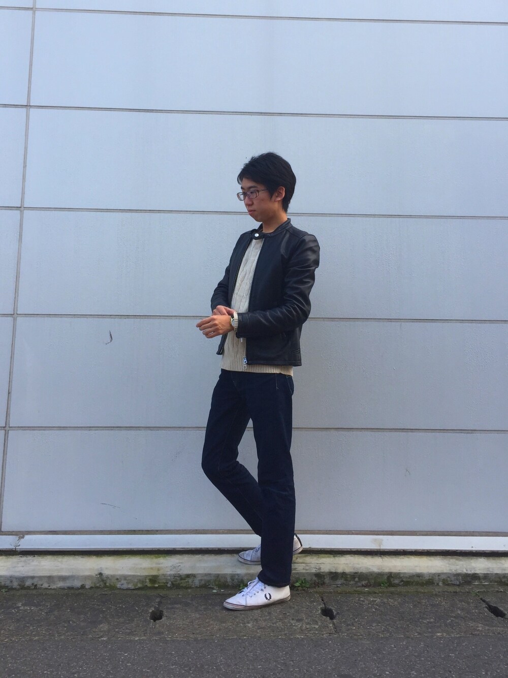 ライダースコーデ! 今回トップスは白ニットをチョイス。デニムはLevi'sの511。 靴はトップスに合わせてフレッドペリーのスニーカー!